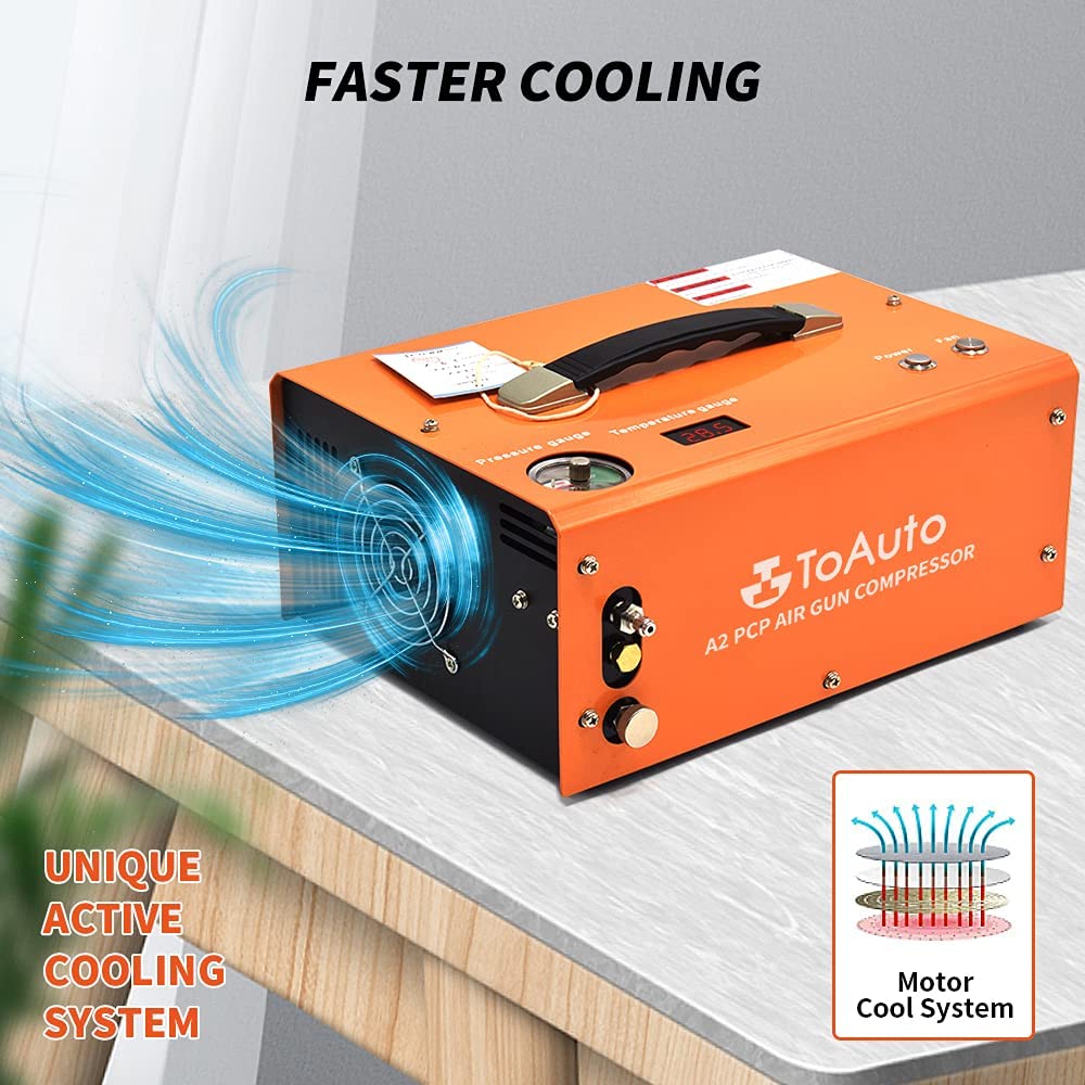 NEW COOL DOWN DELIVERY SYSTEMCompared with other cheap ones in the market, Our A2 PCP air rifle compressor does not need oil, clean and hygienic, no need for an external water pump to cool. Equipped with Built-In Fan Cooling System, faster cooling, effectively give the compressor full protection and make it working stably all the way. Durable quality and Save energy offer a promising PCP journey. |