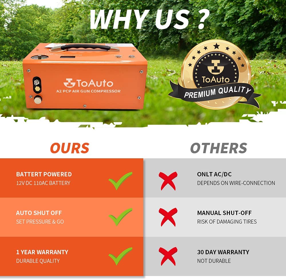 FILL YOUR PCP ANYWHEREPortable Compact Design!! You can hook this A2 PCP compressor to your car battery (12v), plug it into your wall (110v), or hook it to your workshop power (220v). Inflate your equipment PCP air gun or paintball tank anywhere and make it ready for action anytime.TIPS: We the cord supplied is correct for 110V and 12v systems. |