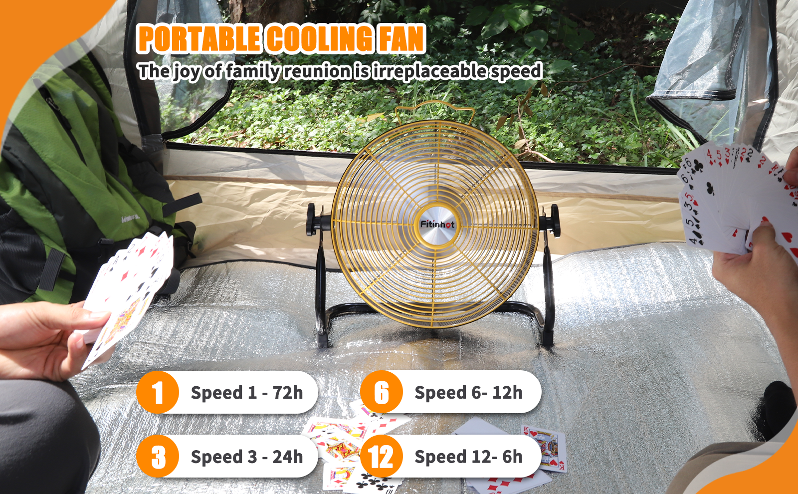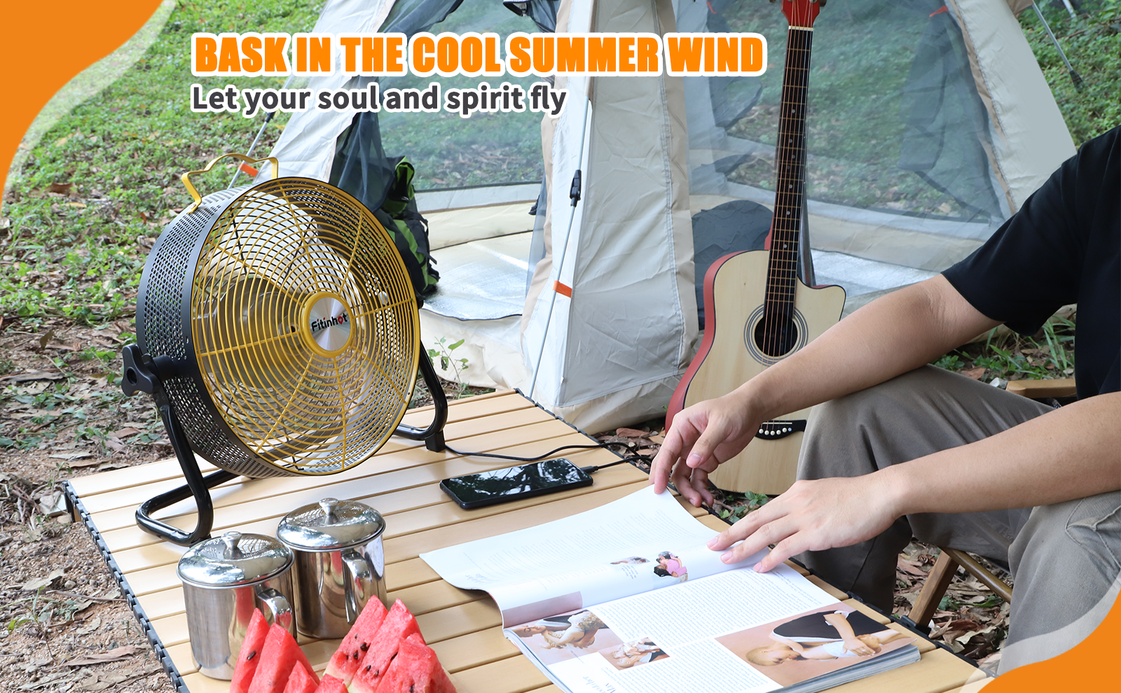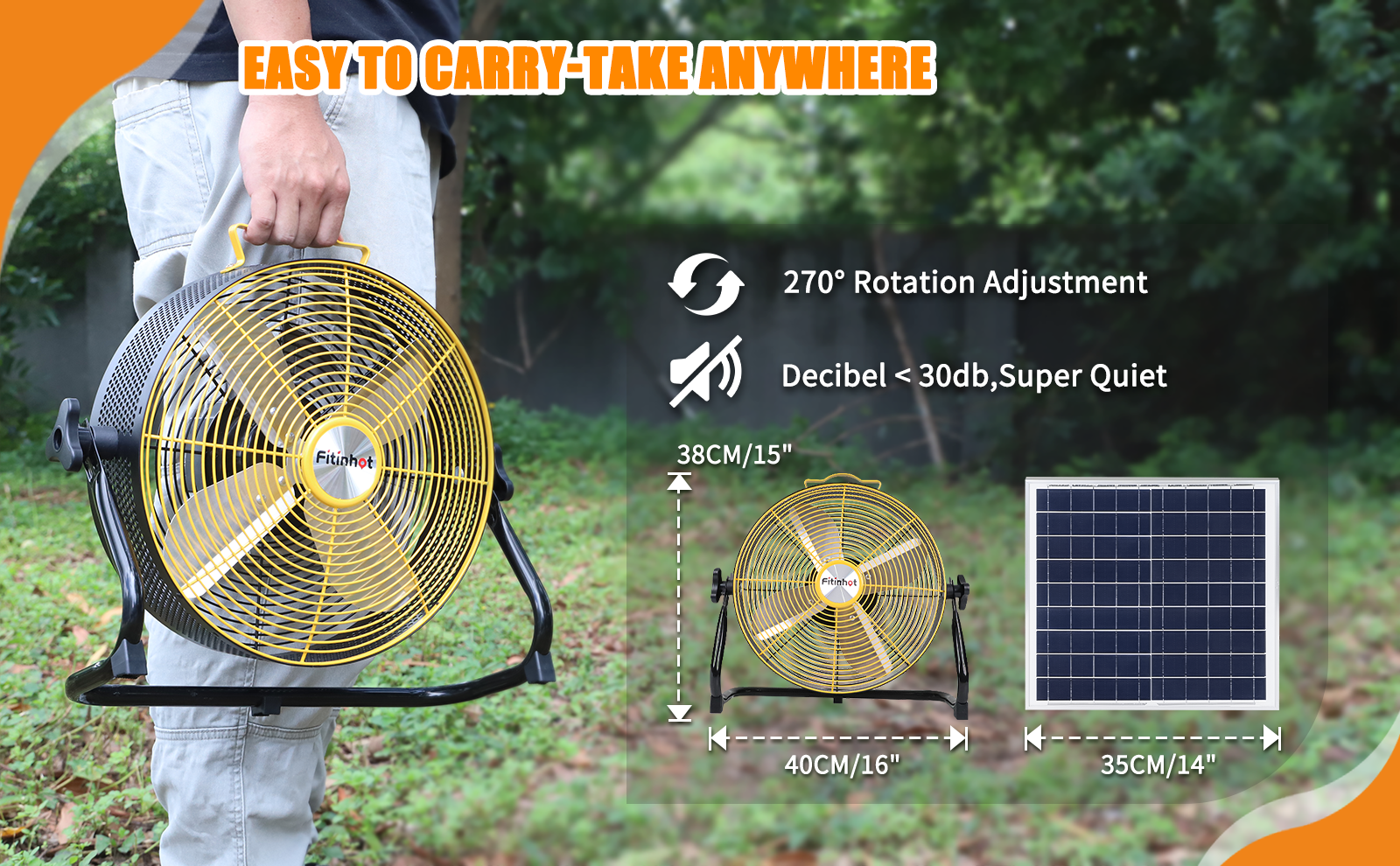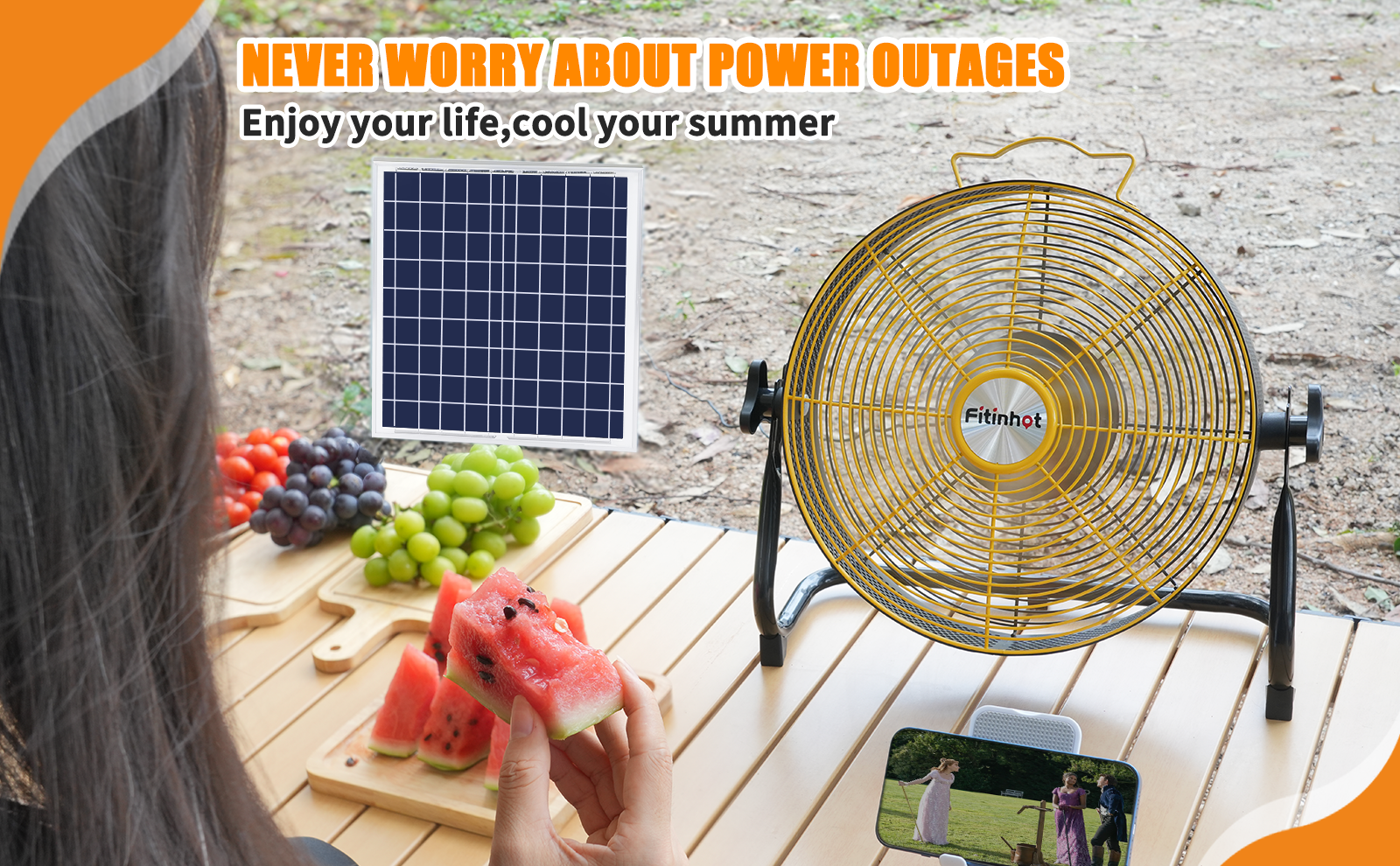 - 【DUAL CHARGING MODE - Solar + Type-C Charging】Fitinhot camping tent fan uses the latest technology to charge. Charge and power a fan outdoors with a solar panel in ample sunlight for 3-6 gear operation, or use the Type-C interface for charging. You can even use the fan while it's charging, and it can act as an emergency power supply to charge your mobile phones, computers, cameras. It's the perfect companion for camping, fishing, and hiking, and a great cooling solution for indoor households.